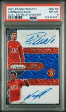 DUAL SIGNATURES PRIZMS BLUE SHIMMER: Dual Signatures Prizms Blue Shimmer bolster the variety of autograph cards available in Hobby packs of Prizm Premier League. Each of these 10 special dual-auto cards showcases a pair of players from a particular club, and the set includes stars of both the past and present.