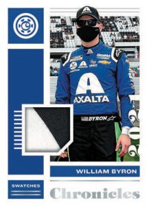 CHRONICLES SWATCHES LAUNDRY TAGS: Chronicles Swatches showcases the various race used materials for drivers, including Sheet Metal, Tires, Fire Suits and Gloves. Look for 5 parallels #’d/49 or less.