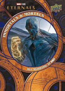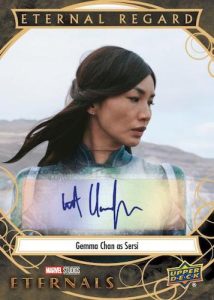 Falling one per pack, inserts include Eternal Scenery, Eternals vs Deviants and Immortals & Mortals. Chase die-cut metal designs in Preliminary Profiles and Stars are Eternal. These combine to average one per case.