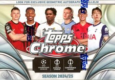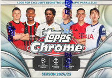 The Breaker Delight edition of 2024/25 Topps Chrome UEFA Club Competitions amplifies the chrome experience with exclusive inserts, deep rookie content, and premium autographs. Featuring standout players from the UEFA Champions League, Europa League, and Conference League, this set offers collectors both high-end chase cards and checklist depth across all tiers of European competition.