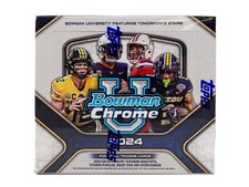 Get ready to storm the field with 2024 Bowman University Chrome Football! This premier collegiate trading card release features the most exciting prospects across the nation in their very first Bowman cards. Look for top prospects like Carson Beck (Georgia), Trevor Etienne (Georgia), Ollie Gordon II (Oklahoma State), DJ Uiagalelei (Florida State), and Nico Iamaleava (Tennessee)!