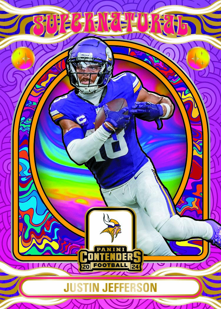 2024 Panini Contenders Football Hobby: 6 packs, 5 autographs per box with iconic Rookie Ticket RPS signatures and premium inserts like Supernatural & Crown Jewels.