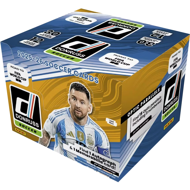 2025-26 Panini Donruss Road to FIFA World Cup Soccer Hobby delivers 1 autograph, 1 memorabilia, 6 numbered parallels, 12 Optic Holos, and 48 inserts per box. Exclusive Kaboom! parallels and rare dual autographs headline a deep international checklist with rookies, stars, and legends.