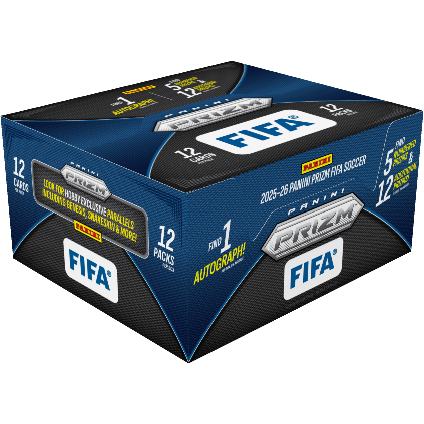 Experience 2025-26 Panini Prizm FIFA Soccer Hobby with 1 autograph, 4 Silver Prizms, 5 numbered Prizms, 8 additional Prizms, and 6 inserts per box! Hunt hyper-rare Color Blast and club legends, plus an all-club 300-card set packed with rookies and global stars. Exclusive Hobby parallels and sought-after inserts await!