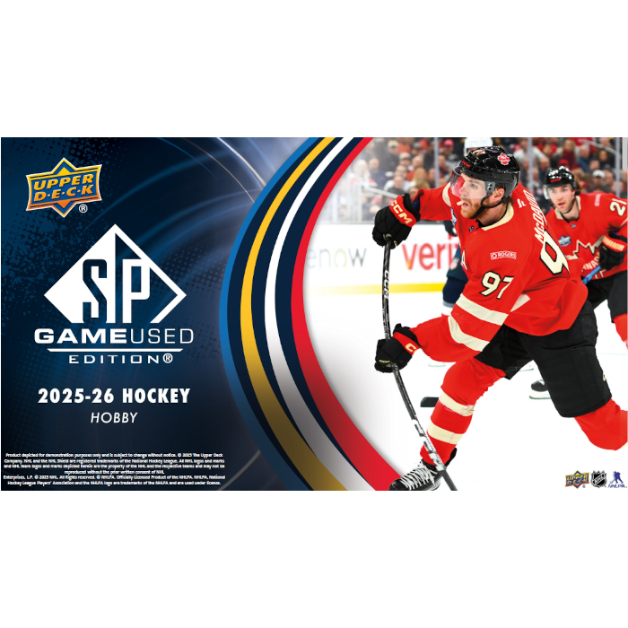 Experience 2025-26 Upper Deck SP Game Used Hockey! Each box delivers 9 cards with 4 autograph, memorabilia, or tech hits per box. Chase iconic event-used memorabilia, low-numbered rookie & legend cards, Draft Day Marks autos, and rare Puck Relics. Featuring a deep checklist of NHL stars, legends, and top rookies.