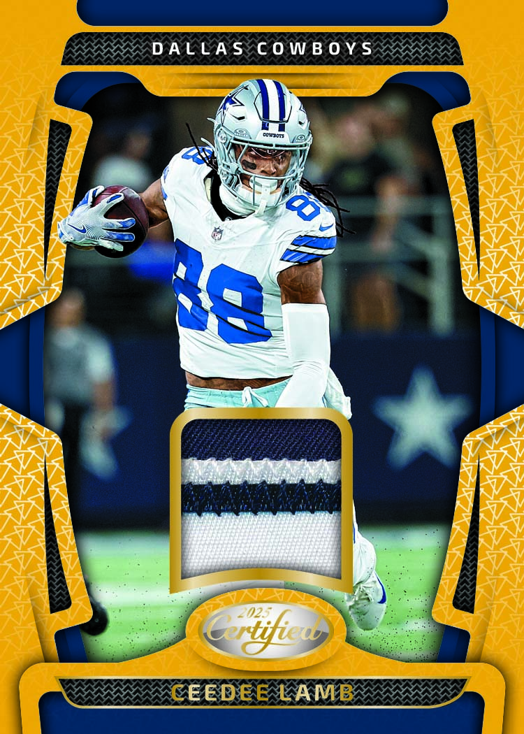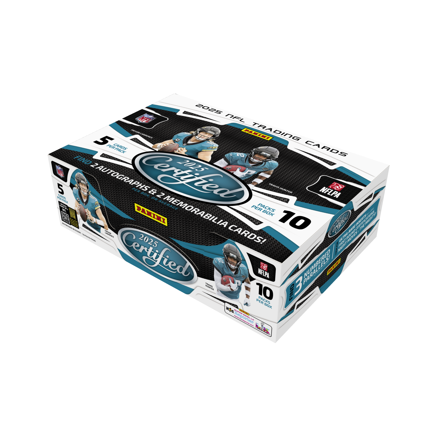 2025 Panini Certified Football Hobby offers 1 Freshman Fabric Signature, 1 additional autograph, 2 memorabilia cards, 10 inserts, and exclusive SSPs per box. Chase ultra-rare “The Mighty,” “Night Moves,” and “First Round Certifications” with deep NFL rookie, star, and legend checklists. 10 packs, 5 cards each.