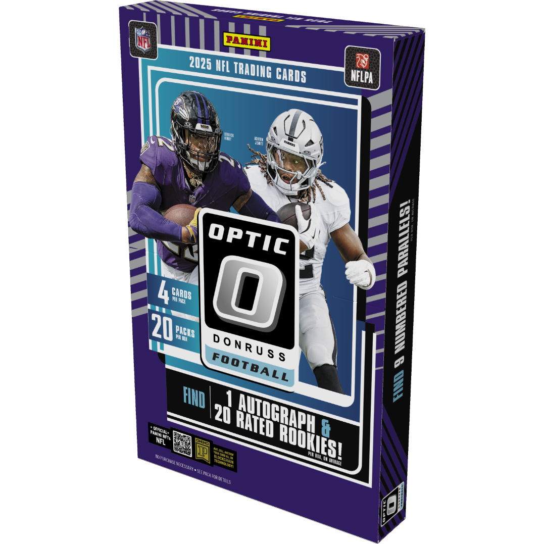 2025 Panini Optic Football Hobby delivers 1 autograph, 20 Rated Rookies, 12 parallels (9 numbered), and 4 inserts per box. Chase ultra-rare Downtown case hits, Hobby-exclusive parallels like Black Pandora, Ice, and Gold Vinyl, plus coveted rookie and legend content in an Optichrome checklist built for collectors.