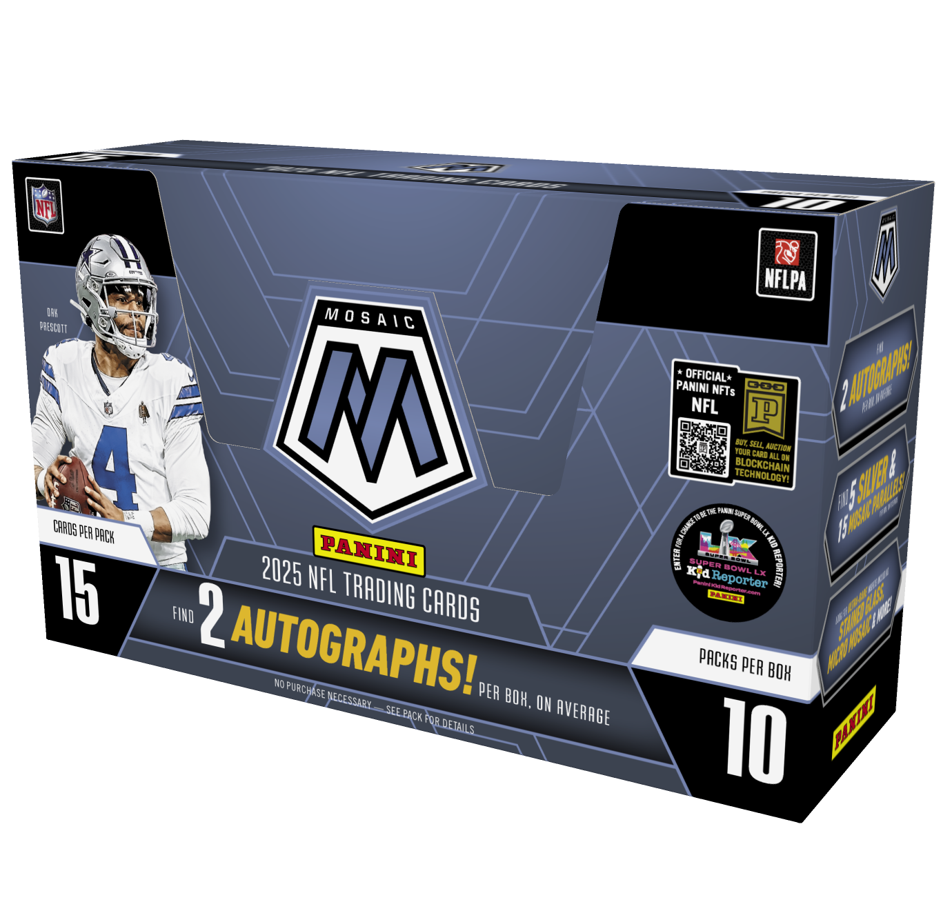 2025 Panini Mosaic Football Hobby features 2 autographs, 5 Silver Prizms, 15 Mosaic Prizms, and 20 inserts per box. Chase jaw-dropping SSP case hits like Micro Mosaic and Stained Glass, plus exclusive parallels and a deep checklist of top rookies, stars, and legends. A must-have for NFL collectors!