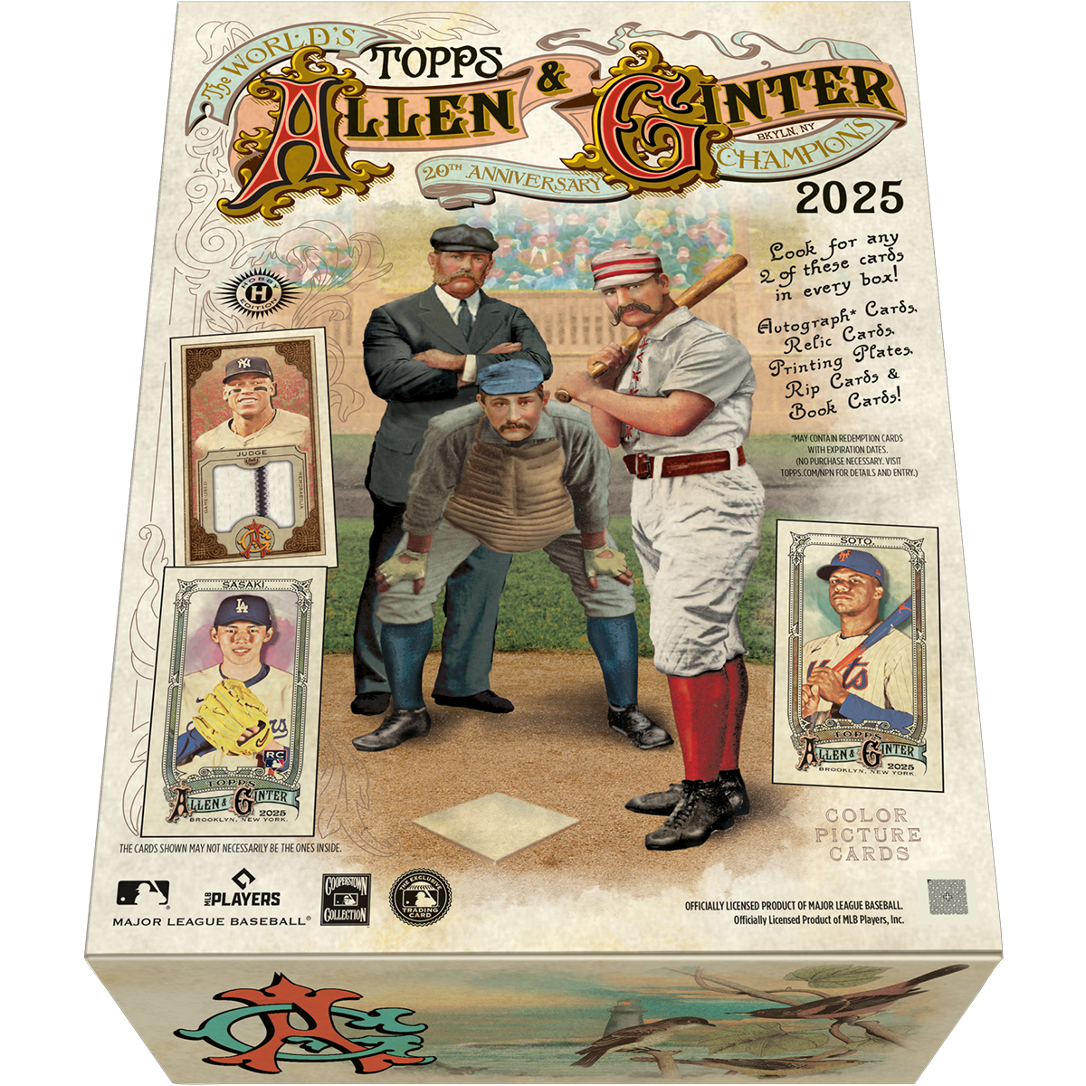 2025 Topps Allen & Ginter Baseball Hobby celebrates the brand’s 20th anniversary with an eclectic mix of MLB stars, rookies, legends, and icons from pop culture. This Hobby product delivers 2 hits per box—with the chance at on-card autographs, relics, cut signatures, and famed Rip cards, plus Hobby exclusives like DNA relics and wood mini cards. Collectors will chase baseball’s best, including electric rookies, current standouts, and retired legends, amid a set that spotlights the historic and the unexpected from across the world of sports and entertainment.