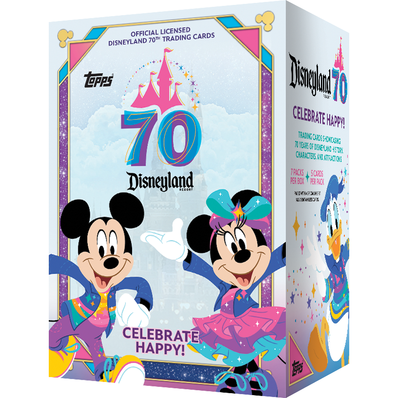 Celebrate the magic with 2025 Topps Disneyland 70th Anniversary Value! Each box delivers 7 packs of 5 cards, including exclusive Pink Shimmer & Rainbow Parallels. Look for rare case-hit Entrance to Magic Chrome, vibrant inserts, and iconic autographs. Deep checklist spotlights Disneyland history, stars, and chase cards.
