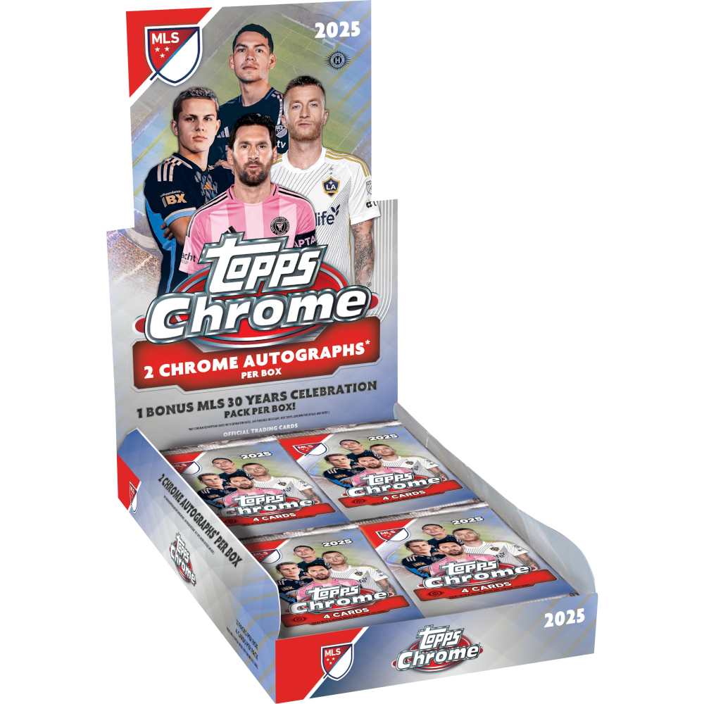 2025 Topps MLS Chrome Soccer Hobby delivers 2 autographs per box, exclusive parallels, and a bonus MLS 30 Years Celebration Pack. Chase dazzling Hobby-only Lavas, big rookie stars, legendary names, rare inserts, and premium patch autos—in a loaded 200-card checklist with case-hit variations and super-rare pulls!