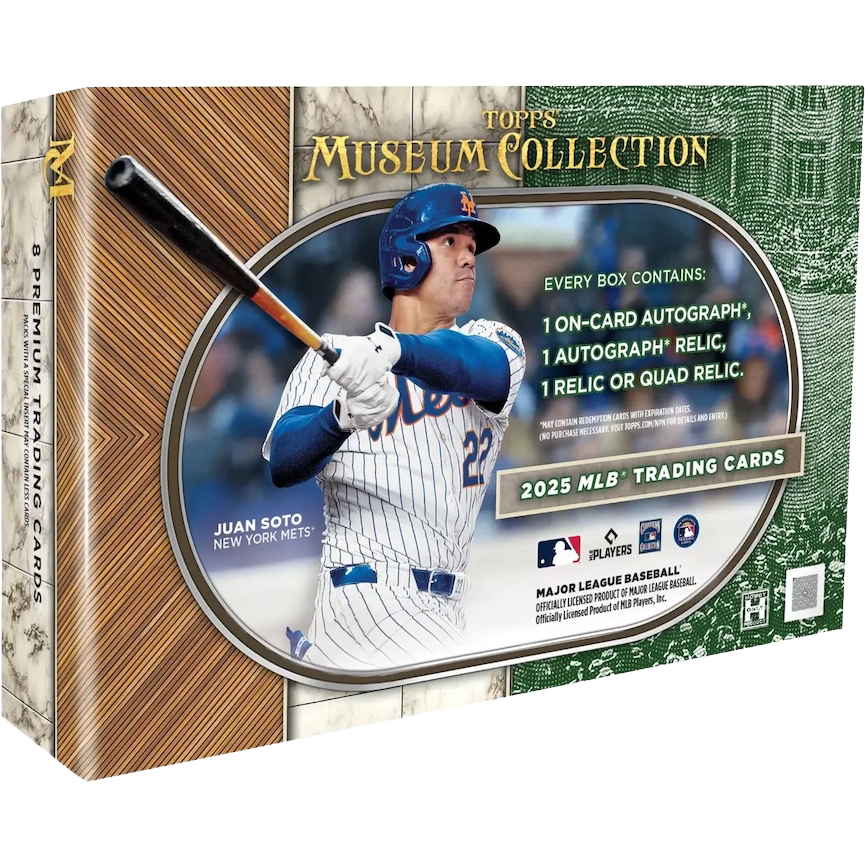 2025 Topps Museum Collection Baseball delivers 1 box with 8 cards: 1 autographed relic, 1 on-card auto, 1 relic or quad relic, 3 base, and 2 parallels. Chase unique autograph sets, sketch cards, and museum-level memorabilia! Find retired and rookie stars in a deep checklist plus all-new Black Diamond parallels and inserts.