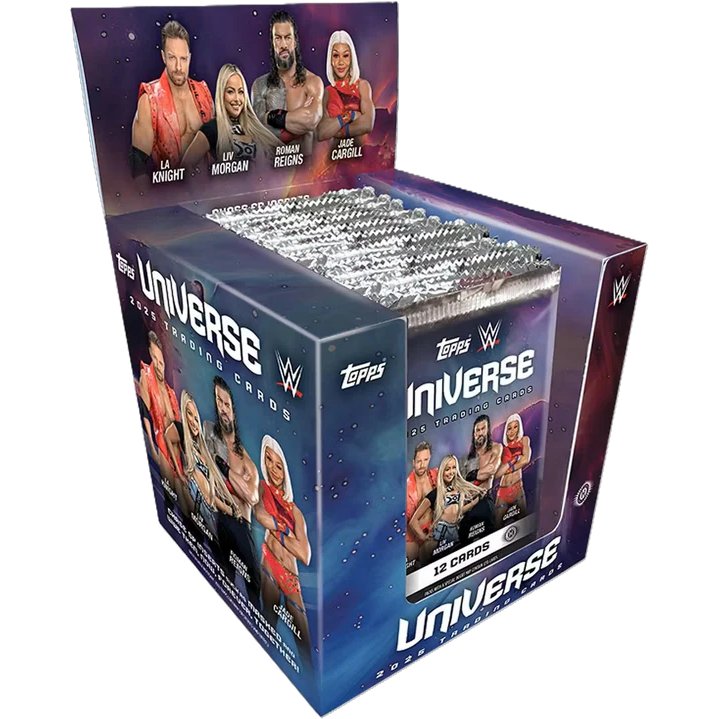 Unleash cosmic collecting with 2025 Topps Universe WWE Hobby! Each box delivers 2 autographs and 1 relic, vibrant color parallels, and ultra-rare case hit inserts. Dive into a 300-card checklist starring legends, current icons, and top prospects in this Hobby-exclusive debut—perfect for WWE rookie and superstar collectors!