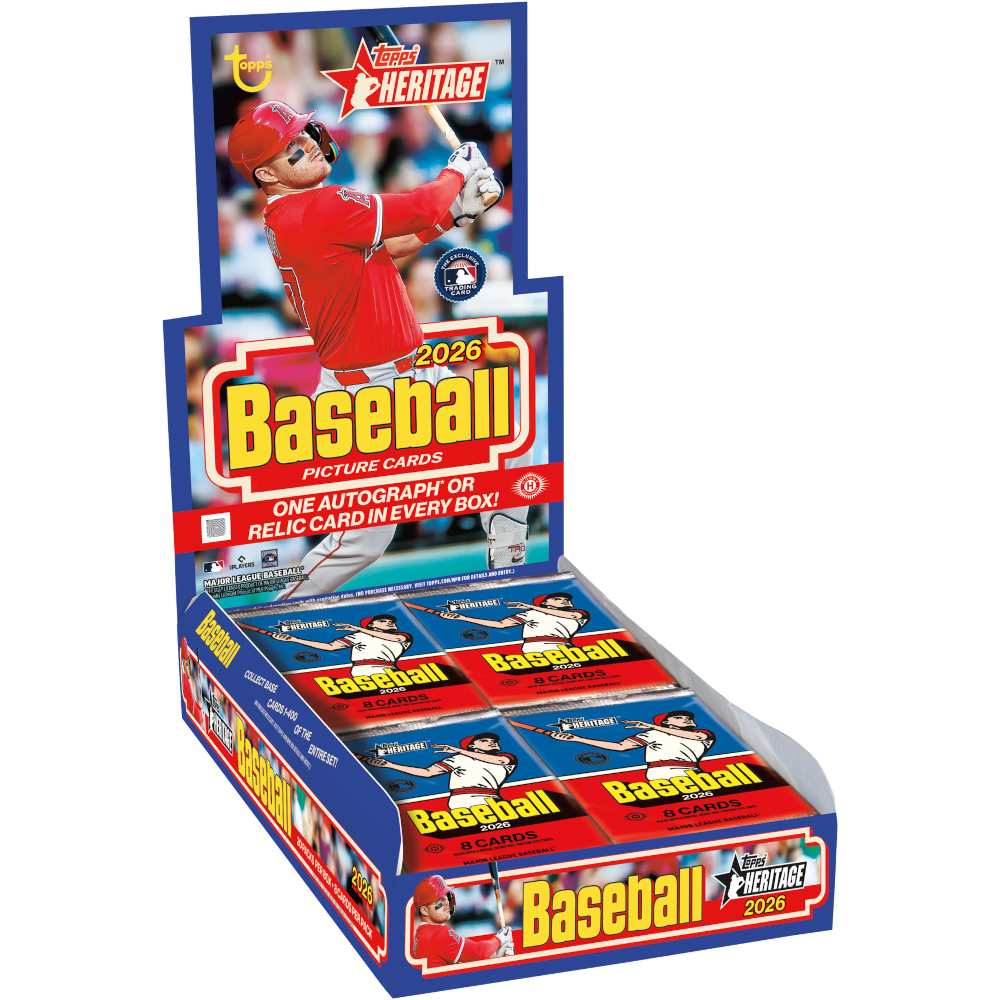 2026 Topps Heritage Baseball Hobby celebrates the classic 1977 Topps design, bringing retro style to today’s MLB stars, rookies, and legends. Set builders and collectors can chase a 400-card base set with League Leaders, Record Breakers, Quad Rookies, and unique “Turn Back the Clock” cards. This Hobby edition is the only place to find exclusive Dark Gray Bordered base parallels and Light Blue Speckle Chrome variations. Discover autographs and relics from legends and current standouts, with chase cards of top players like Shohei Ohtani, Aaron Judge, Gunnar Henderson, Elly De La Cruz, and Jackson Holliday.