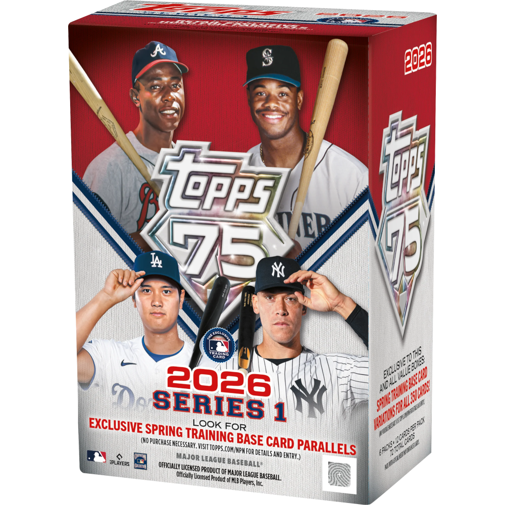 2026 Topps Series 1 Baseball Value delivers 6 packs of 12 cards per box, highlighting the 75th anniversary of Topps. Find exclusive Spring Training parallels, top MLB rookies and veterans, plus autograph and relic hits. Deep checklist and unique Value Box exclusives make this a can’t-miss release.